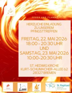Freitag, der 22. Mai von 18.00-20.30 Uhr und Samstag, der 23. Mai von 10.00-20.30 Uhr stehen ganz im Zeichen des Heiligen Geistes. Zusammen mit der Pfarrei St. Marien veranstalten wir von St. Raphael aus in St. Hedwig einen Tag rund um den Heiligen Geist. Es wird ein Tag des Gebets, des Austauschs und der Freude am Lobpreis sein. Wir wollen die Gegenwart und Führung des Heiligen Geistes feiern und ehren. Der Freitagabend ist geprägt von Anbetung und Beichte, am Samstag werden neben geistlichen Vorträgen auch persönliche Zeugnisse zu hören sein. Auch für die Begegnung untereinander und gemeinsames Essen wird viel Zeit sein. Der Tag wird mit einer Eucharistiefeier beschlossen.